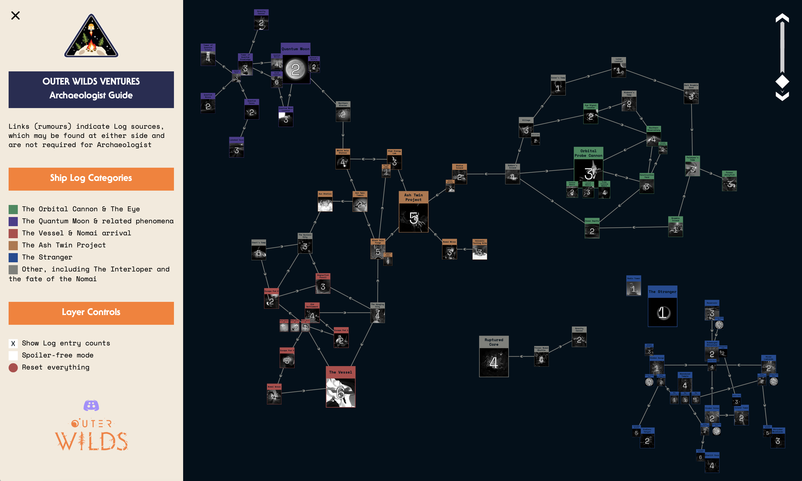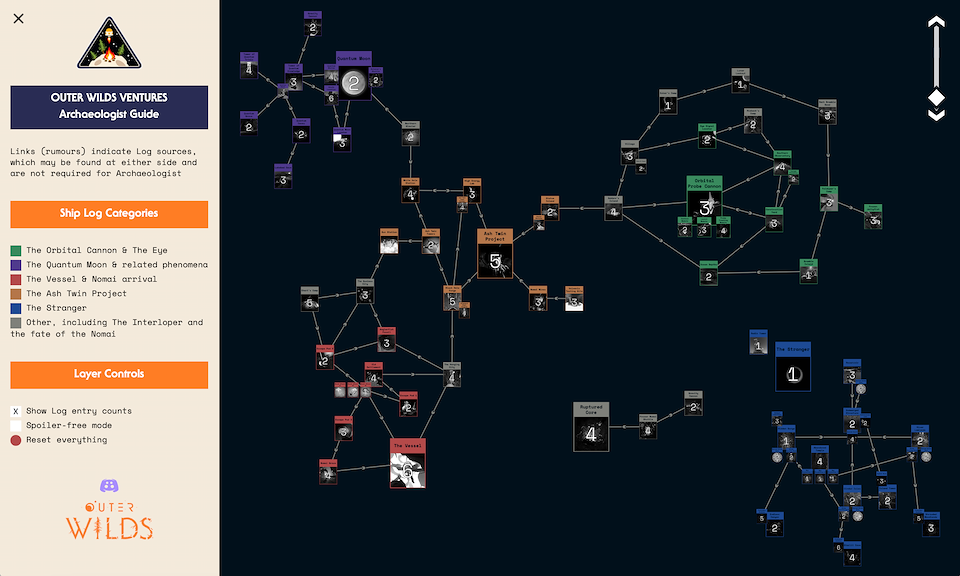 Interactive map website to help players explore and track their progress in independent videogame Outer Wilds. Thousands of hits monthly.